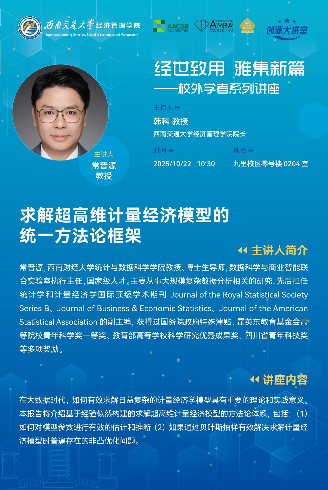 Speaker ProfileCHANG Jinyuan is a Professor and Doctoral Supervisor at School of Statistics and Data Science, Southwestern University of Finance and Economics, and Executive Director of Joint Laboratory for Data Science and Business Intelligence. He is a recipient of a national-level talent award, with research focusing on the analysis of large-scale, complex data. He is an Associate Editor for top-...