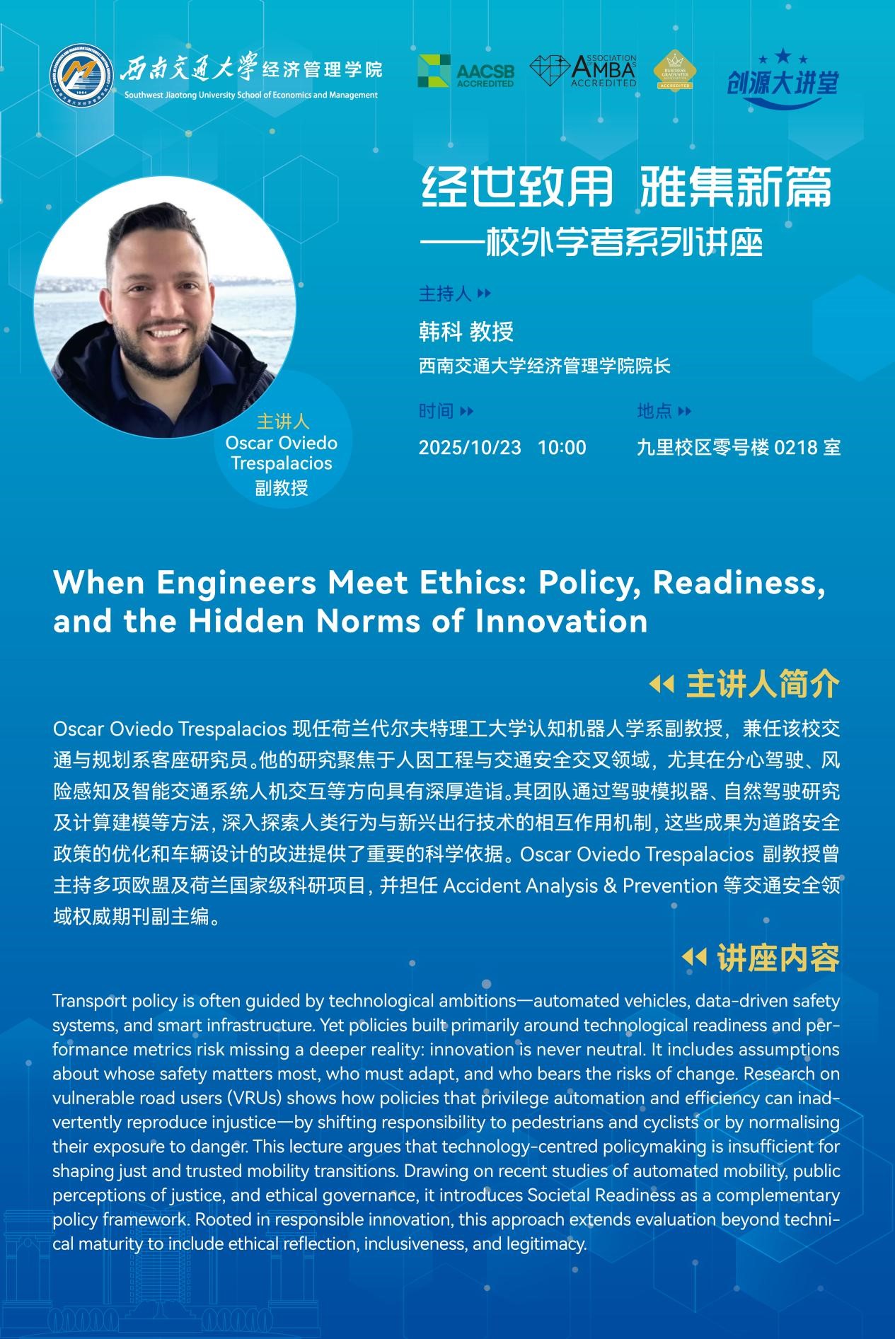 Speaker ProfileOscar Oviedo Trespalacios is an Associate Professor in Department of Cognitive Robotics at Delft University of Technology, where he also holds a position as a Guest Researcher in Department of Transport and Planning.His research lies at the intersection of human factors engineering and transport safety, with particular expertise in distracted driving, risk perception, and Human-Machine ...