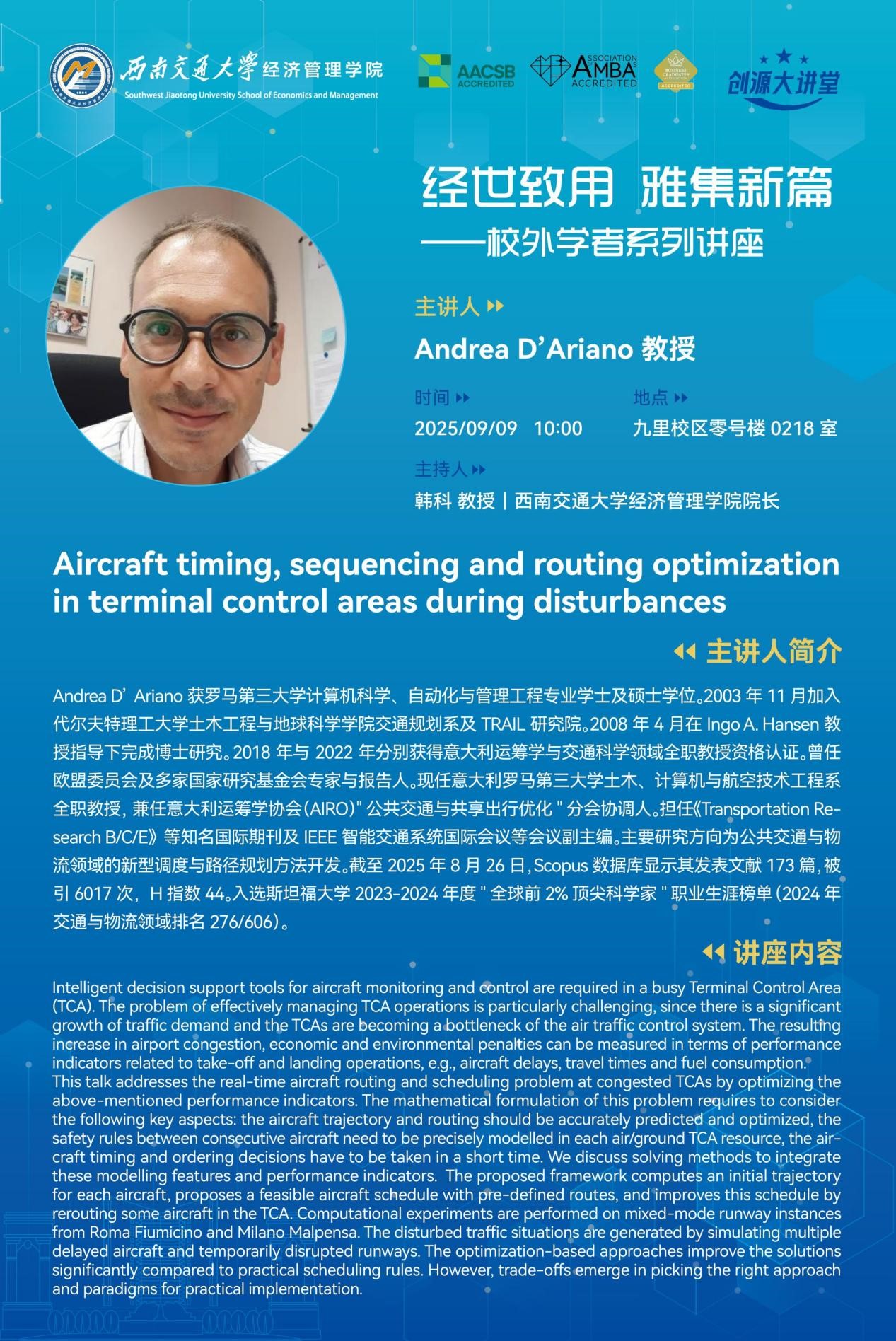 Speaker ProfileAndrea D’Ariano holds Bachelor's and Master’s degrees in Computer Science, Automation, and Management Engineering from Roma Tre University.In November 2003, he joined Department of Transport and Planning at Faculty of Civil Engineering and Geosciences at Delft University of Technology, as well as the TRAIL Research School. He earned his PhD in April 2008 under the supervision of Professor ...