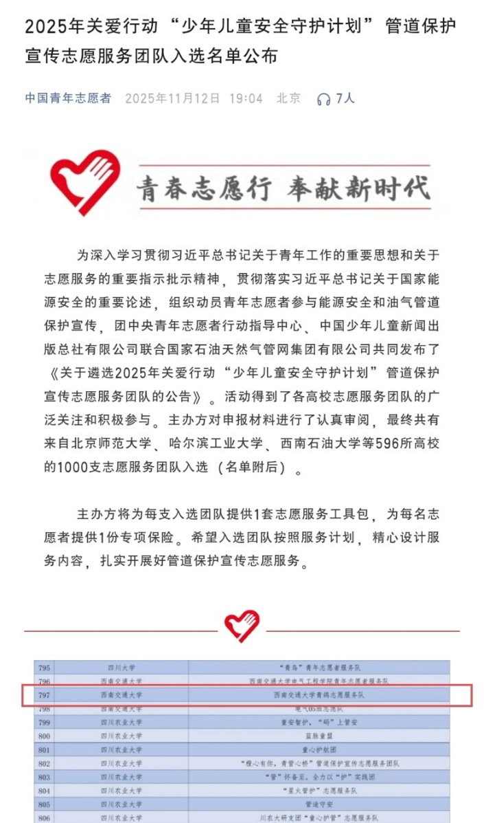 为深入学习贯彻习近平总书记关于青年工作的重要思想和关于志愿服务的重要指示批示精神,贯彻落实习近平总书记关于国家能源安全的重要论述,组织动员青年志愿者参与能源安全和油气管道保护宣传,团中央青年志愿者行动指导中心、中国少年儿童新闻出版总社有限公司联合国家石油天然气管网集团有限公司共同发布遴选公告,启动2025年关爱行动“少年儿童安全守护计划”管道保护宣传志愿服务团队招募工作。