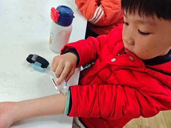 图为小朋友正在进行安全急救课模拟擦伤处理小实验