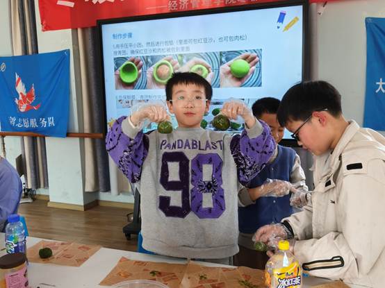 图为小朋友在展示美食课做的青团