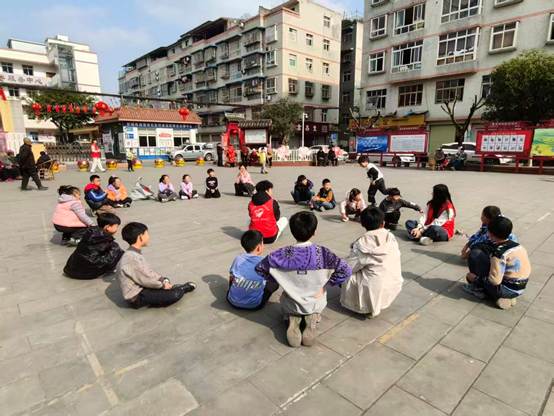 图为实践团队正在带领小朋友们上体育课