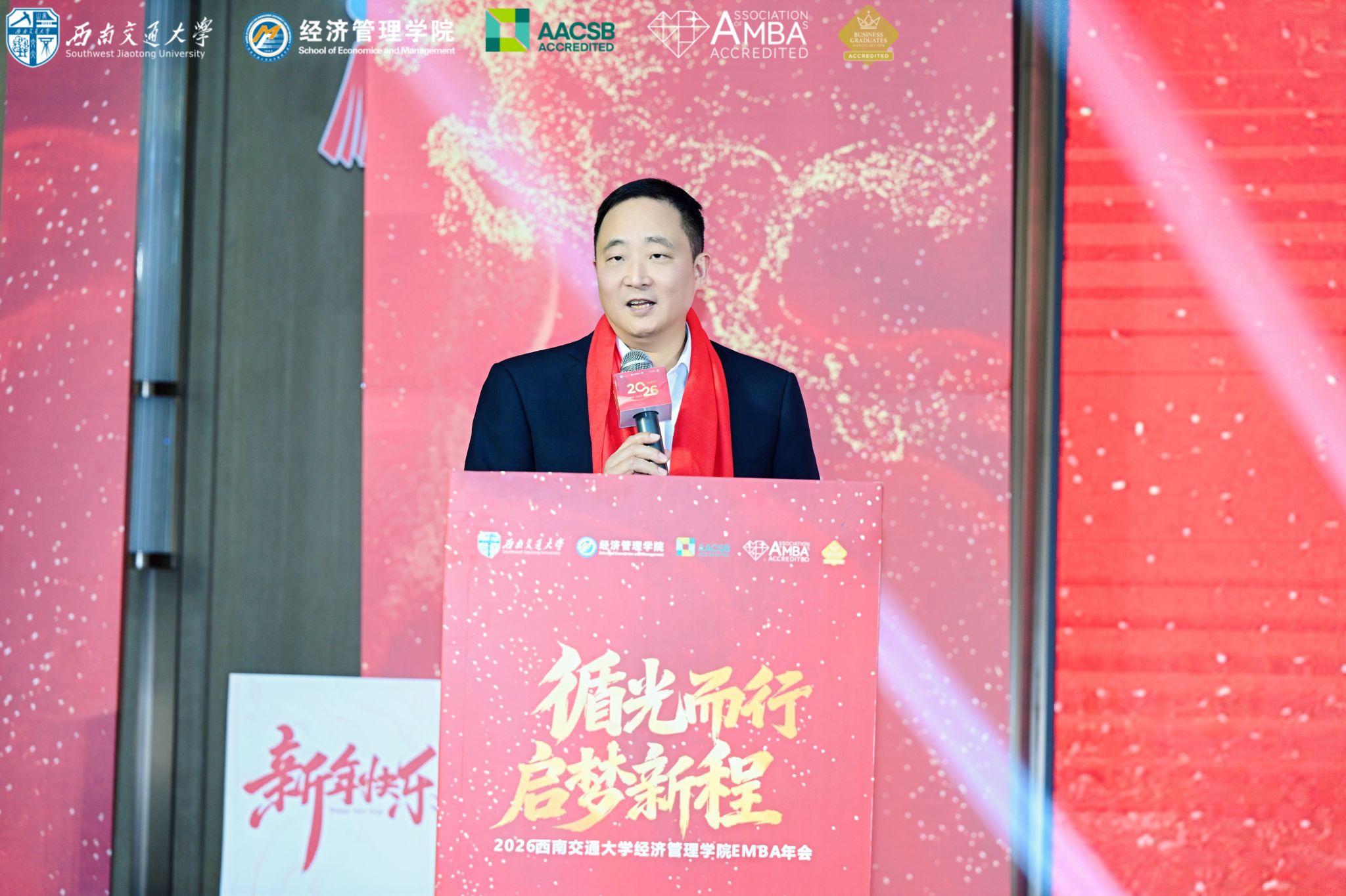 12月28日,2026西南交通大学经济管理学院“循光而行•启梦新程”EMBA年会在成都隆重举行。学校党委副书记高平平、学校职能部处相关领导、经济管理学院党政领导班子、师生代表、兄弟院校嘉宾及各界校友齐聚一堂,共叙同窗情谊,共话发展新篇,在欢声笑语中凝聚奋进力量,共启未来新程。