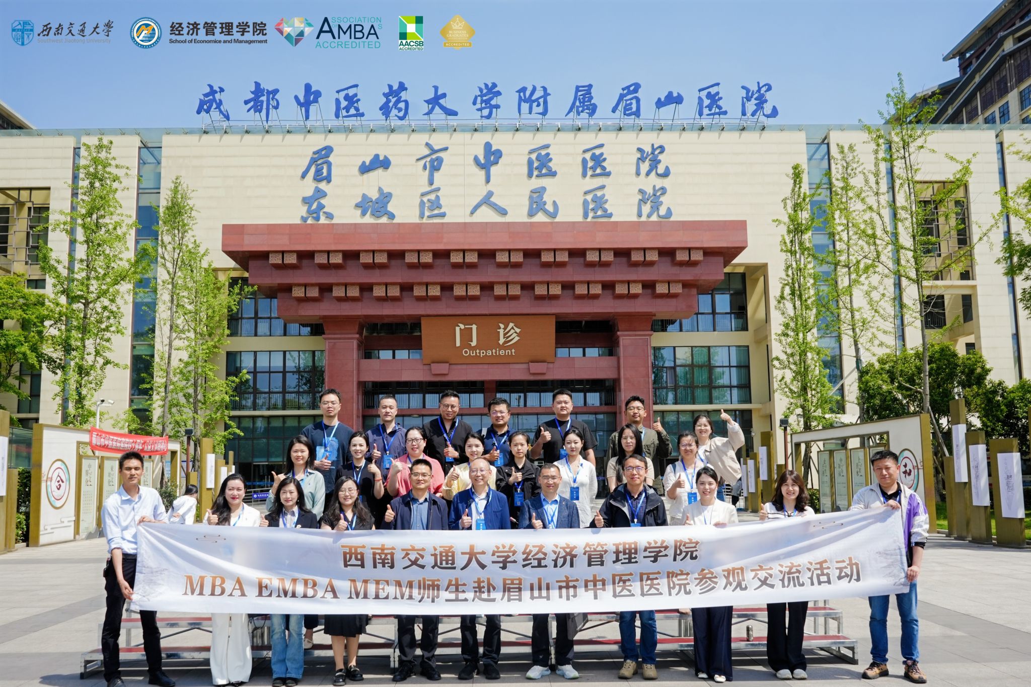 2026年4月23日下午,西南交通大学经济管理学院组织开展了“竢实商访”系列活动之眉山市中医医院参观交流。本次活动由学院副院长李良带队,副院长聂佳佳、教授耿维、副教授李一员、专业学位教育中心常务副主任李洪辉、校友工作办公室副主任袁小容、学生事务主管姚霁芸和宋洁老师共同参与。来自学院MBA、EMBA、MEM项目的三十余名师生一同前往眉山市中医医院,进行实地参访与座谈交流。