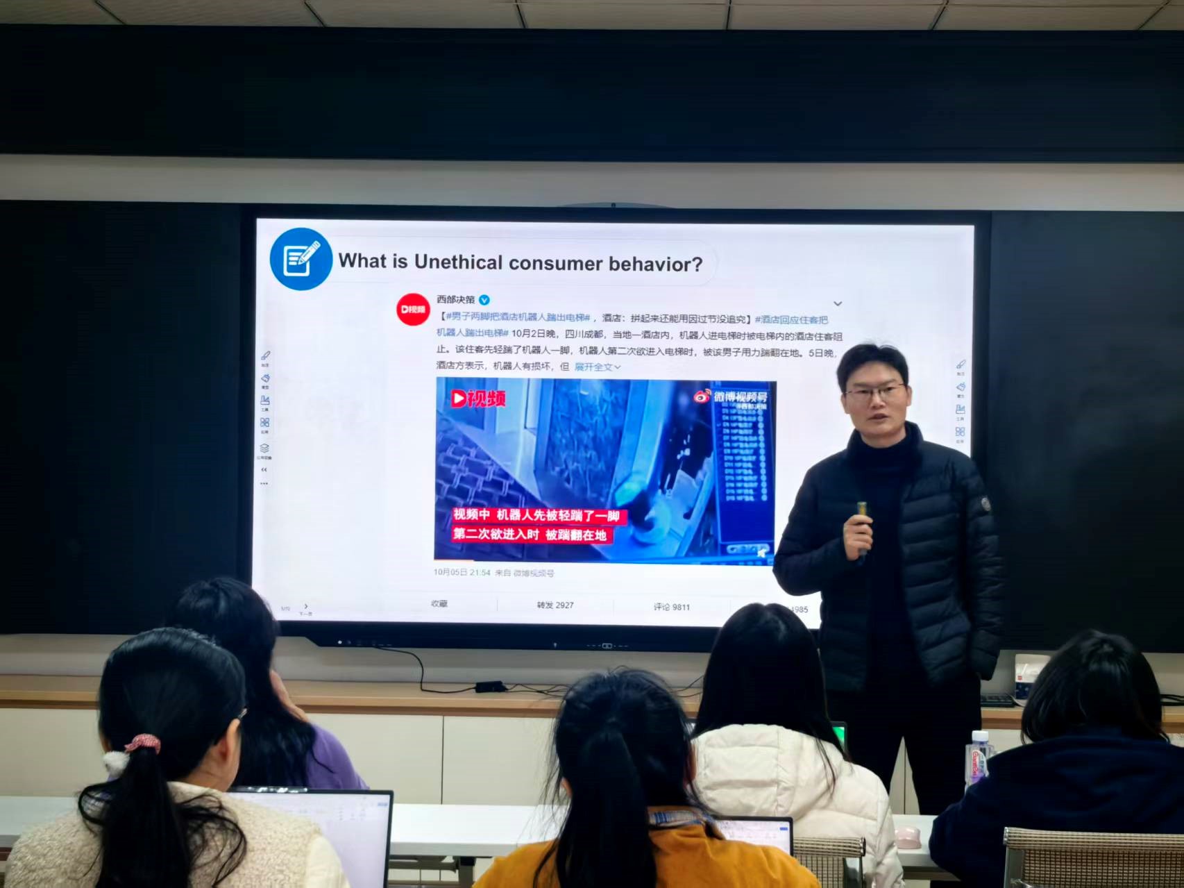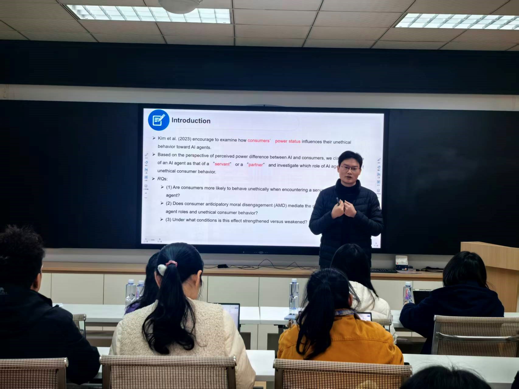 2025 年 11 月 18 日下午,西南交通大学经济管理学院 “踏新章 绽华光” 新青年教师系列讲座在九里校区零号楼 0411 室如期举行。本次讲座由市场学系助理教授雷韶辉主讲,聚焦 “AI 技术应用背景下的消费者伦理问题”。该系主任范春梅副教授主持讲座,学系部分师生参加了此次讲座。