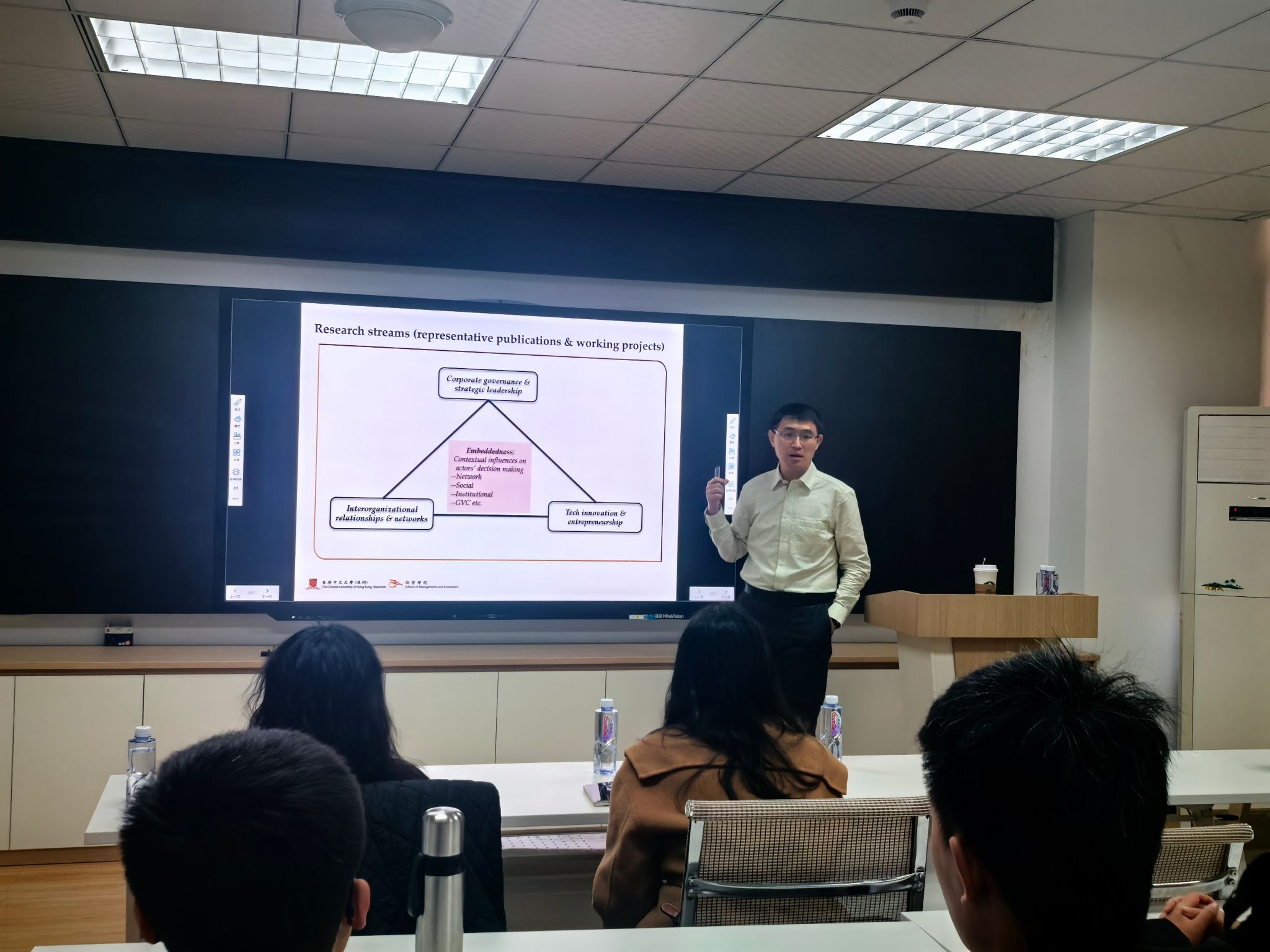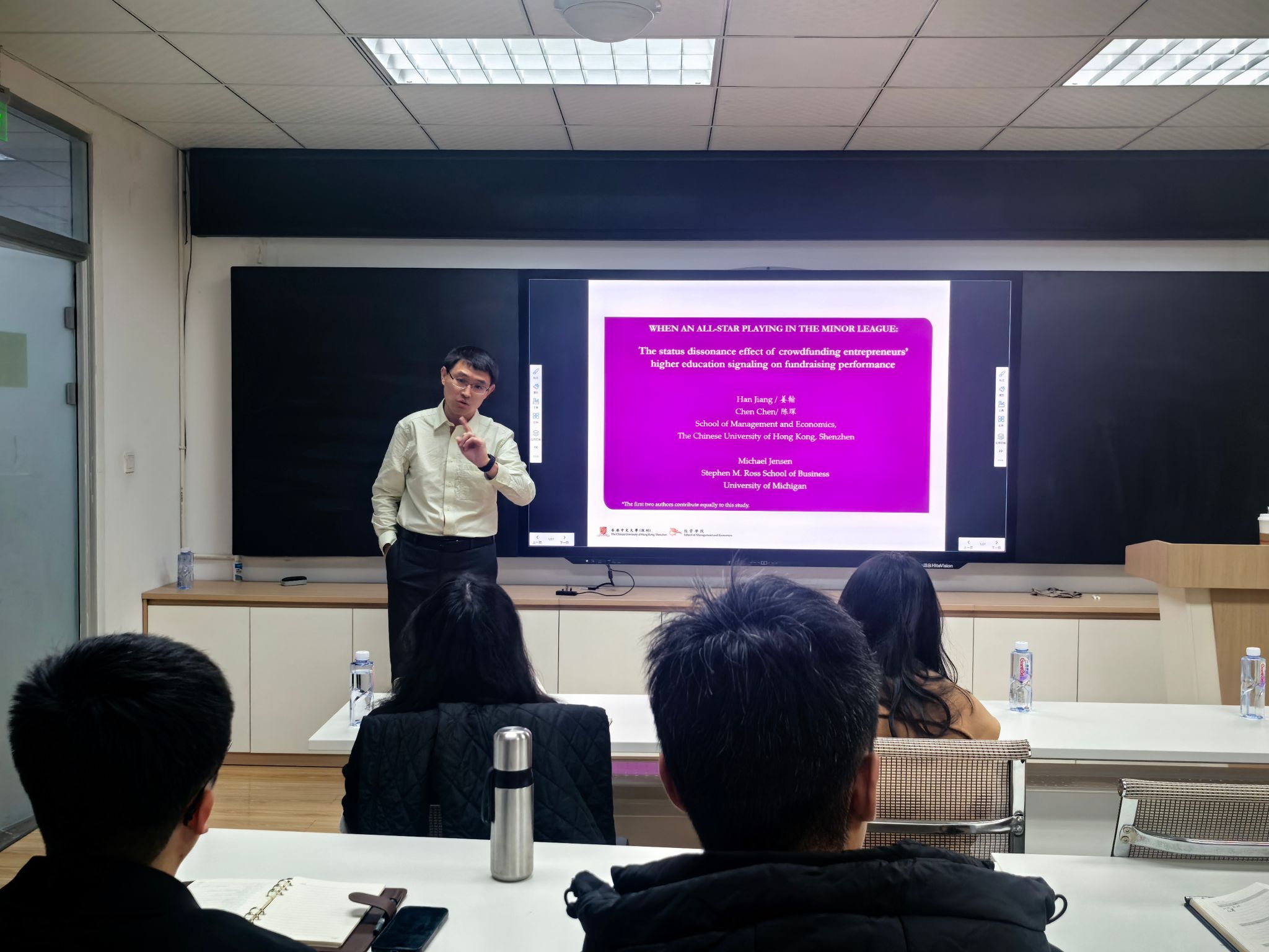 2025年12月23日上午,香港中文大学(深圳)经管学院姜翰副教授应邀为我院师生带来一场题为“An All-star Starting to Play in the Minor League: The Status Dissonance Effect of Crowdfunding Entrepreneurs’ Educational and Professional Rhetoric on Fundraising Performance”的学术讲座。本次讲座由经济管理学院创新创业与管理学系陈轩瑾老师主持,学院部分师生参加了此次活动。讲座伊始,陈老师介绍了姜老师的学术背景与成就,并对姜老师的到来表示热烈欢迎。