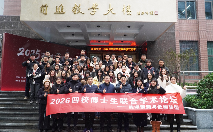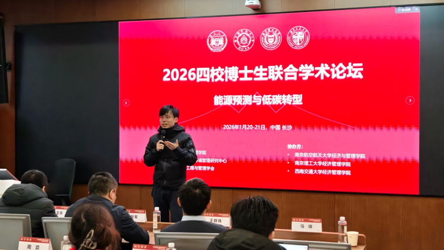 1月20日至21日,由西南交通大学经济管理学院副院长马锋及鲁心洁老师带领我院8位博士生参加了在长沙举办的“2026四校博士生联合学术论坛”。本次论坛以“能源转型与低碳金融”为主题,汇聚来自湖南大学、西南交通大学、南京航空航天大学及南京理工大学的50余位专家学者与青年博士生。
