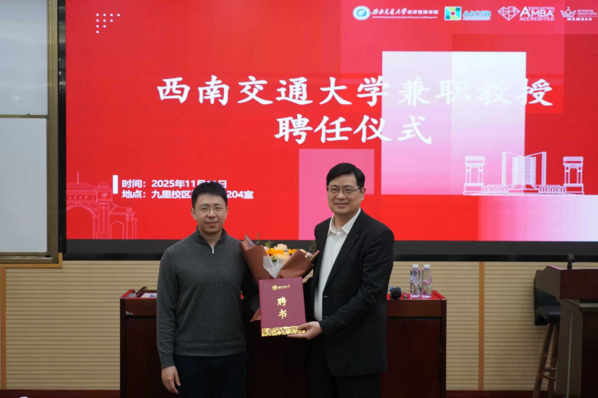 2025年11月11日上午,经济管理学院于九里校区0204室举行香港理工大学工业与系统工程系符啸文教授兼职教授聘任仪式暨航空枢纽建设前沿议题讲座。本次活动由学院院长韩科教授主持。韩科院长为符啸文教授颁发西南交通大学兼职教授聘书,并对符啸文教授加入我校表示热烈欢迎。活动伊始,韩科院长介绍了...