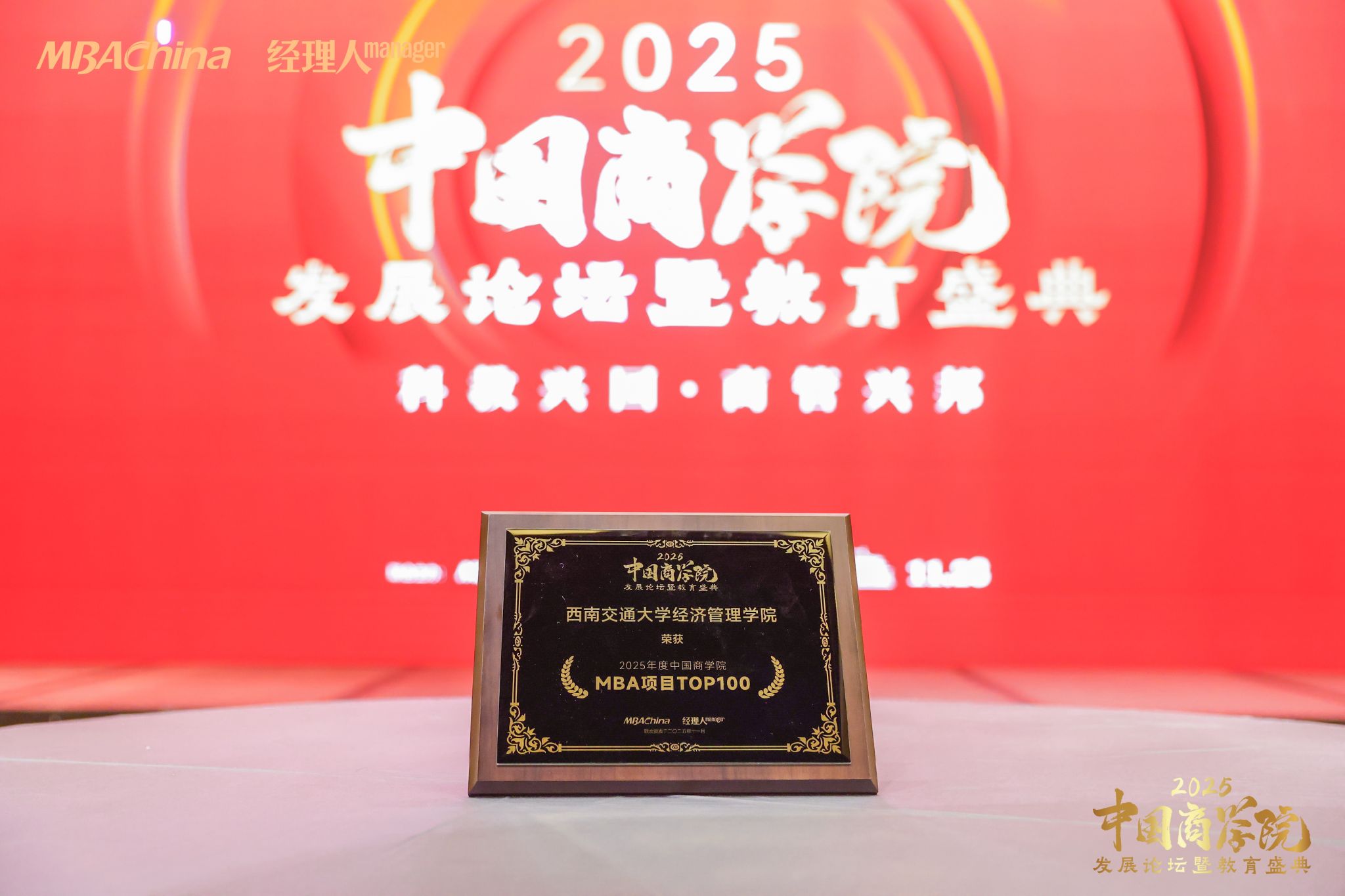 以商学赋能强国建设,以初心培育时代英才。11月28日,由MBAChina与《经理人》杂志联合主办的2025年度中国商学院发展论坛暨教育盛典在北京隆重举行。三百余位教育界专家学者、院校领导、行业领军人物及权威媒体齐聚一堂,分享前沿教育理念,研讨未来发展趋势,共同见证中国商科教育年度荣耀。西南交...